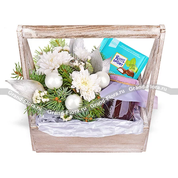 Стандартный: шоколад "Ritter Sport"- 1 шт., варенье - 1 шт., хризантема кустовая - 1 шт., декоративная зелень., новогодний декор, ель., оазис, ящик.