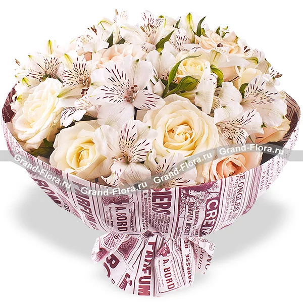 Роскошное сочетание кремовых роз и альстромерий станет великолепным цветочным подарком к любому торжеству!