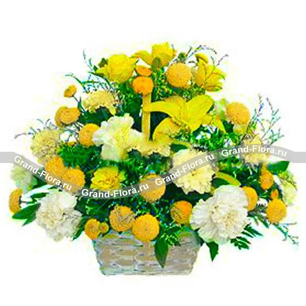 Белоснежные гордые гвоздики, лимонные розы и медовые лилии, окруженные россыпью золотистых  хризантем – это удивительное сочетание величия и изысканности. Если вам нравится эта корзина с гвоздиками и хризантемами, тогда вам прийдется по душе и быстрая и надежная доставка нашей международной службы доставки цветов.